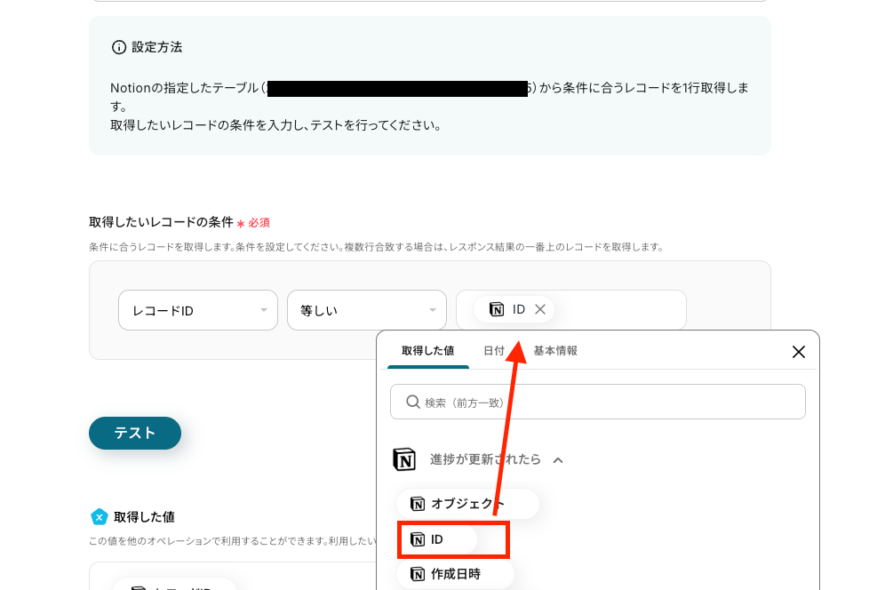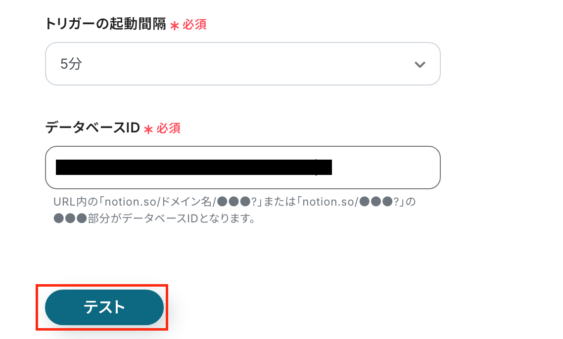 各項目の入力が完了したら、テスト用にNotionのデータベースを更新してから「テスト」をクリックしてください。