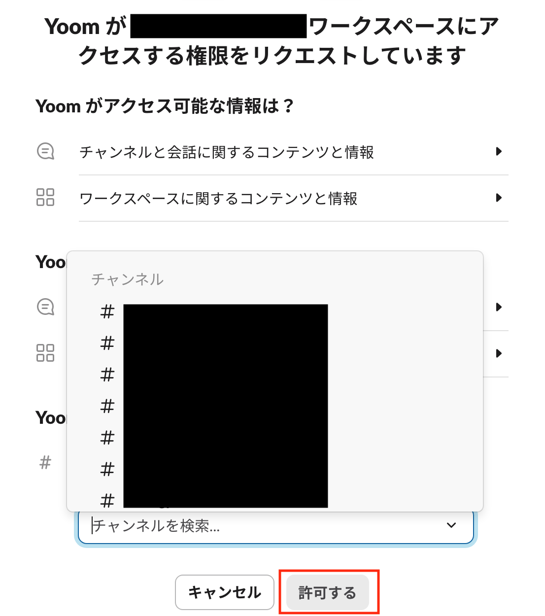 以下の画面が表示されたら、連携したいチャンネルを選択後、赤枠の「許可する」をクリックします。
