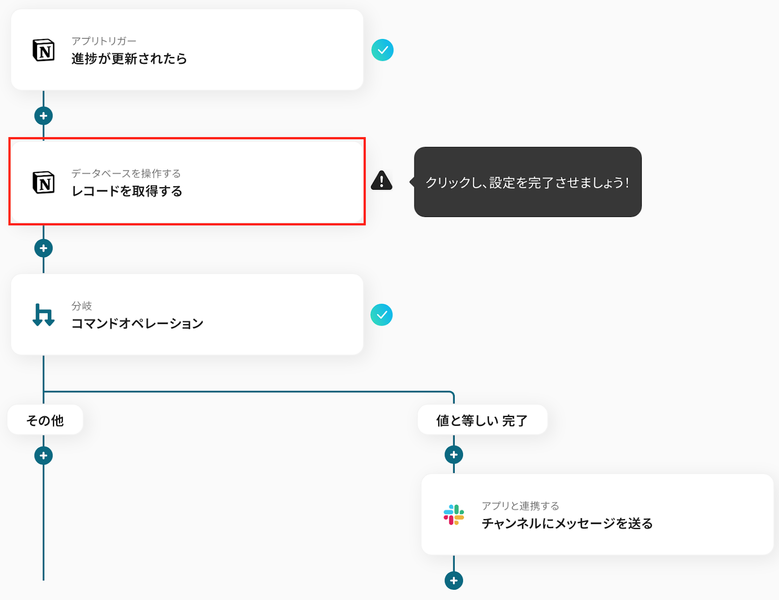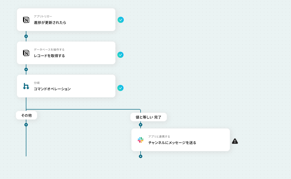 このフローでは、Notionでタスクの進捗が変わった際に自動的にChatworkへ通知が送られるので、チーム全体が業務進捗を漏れなく把握できます。この自動化により、情報共有が迅速になり、コミュニケーションの漏れを防ぎます。