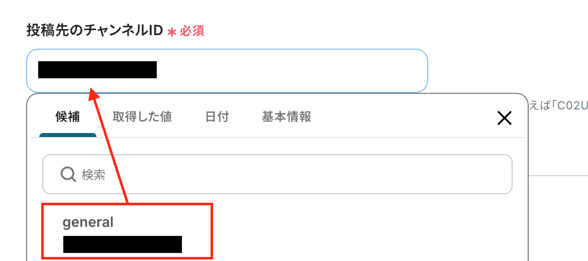 続いて、「API接続設定」の画面で、「投稿先のチャンネルID」と「メッセージ」を設定します。 「投稿先のチャンネルID」は、以下画像のように入力バーをクリックして表示される候補から選択してください。