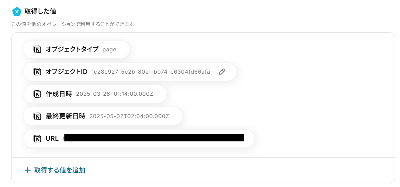 以下のように、任意で作成した文章と「取得した値」から引用した情報を組み合わせて、自由に設定しましょう!