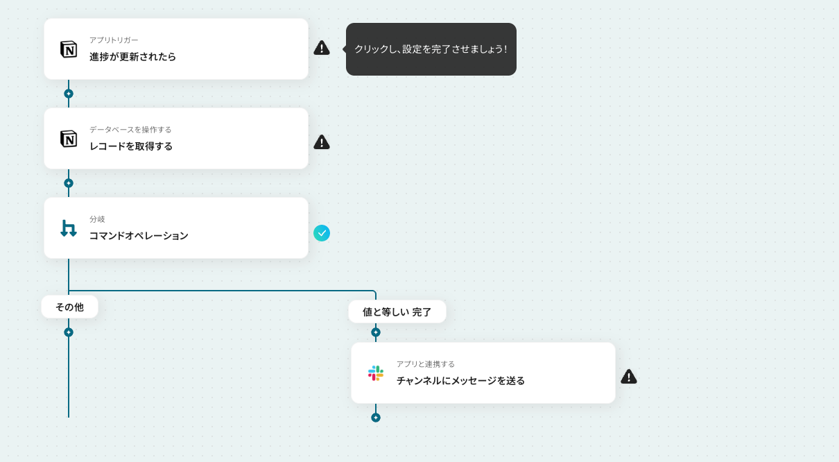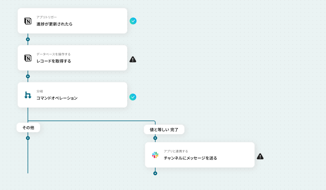 続いて、分岐条件を設定します。 今回は、Notionで進捗が「完了」のステータスになったら、Slackに通知するように設定します。 ここの分岐条件をうまくカスタマイズすることで、利用シーンに合わせた柔軟なデータ管理が可能になります。