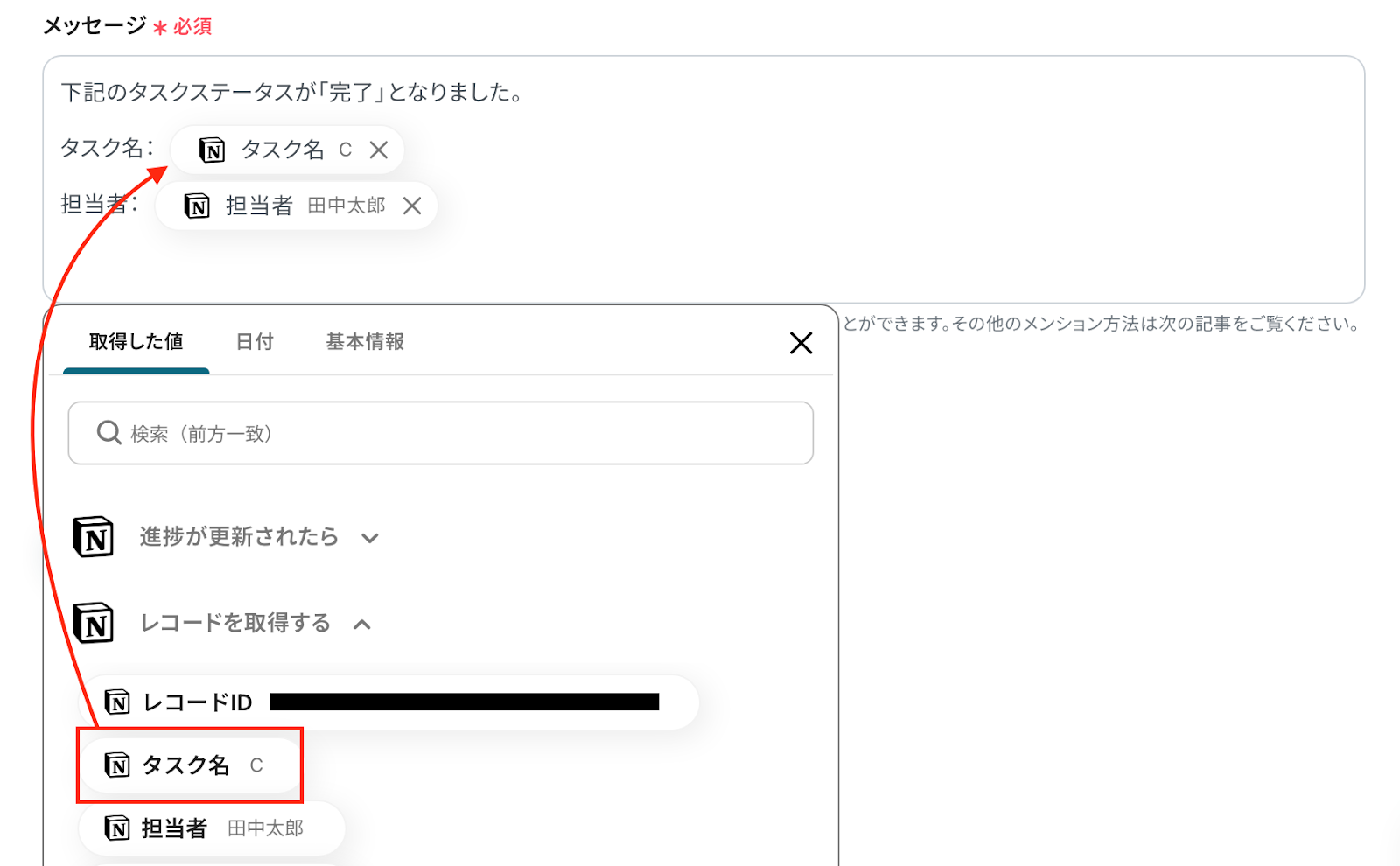 「メッセージ」では、Slackに通知する文章を設定します。 以下のように、任意で作成した文章と「取得した値」から引用した情報を組み合わせて、自由に設定しましょう! メンションを付与したい場合、以下のページを参考に設定を行ってください。Slackでメンション付きのメッセージを送る