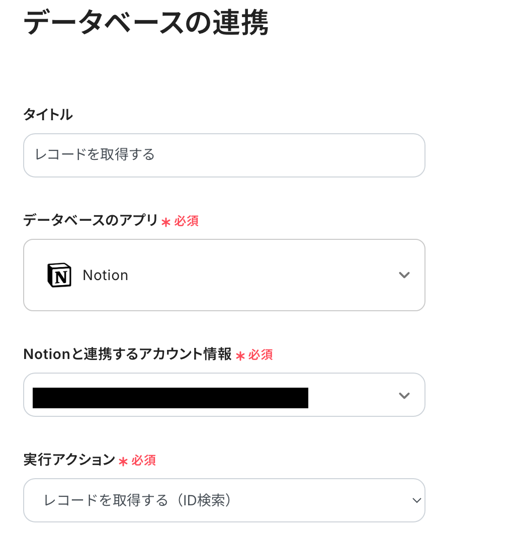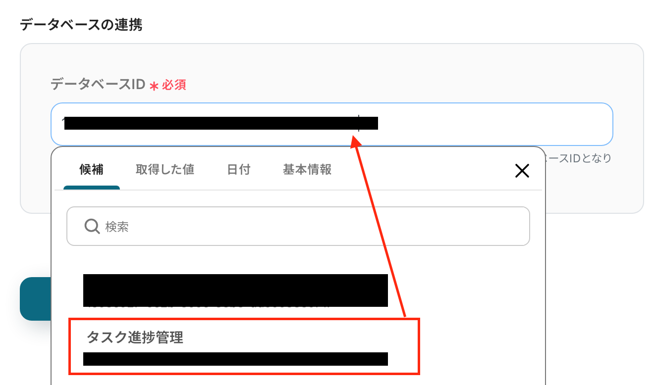 次に、「データベースID」を入力しましょう。以下のように、入力欄をクリックして表示される候補から選択が可能です!