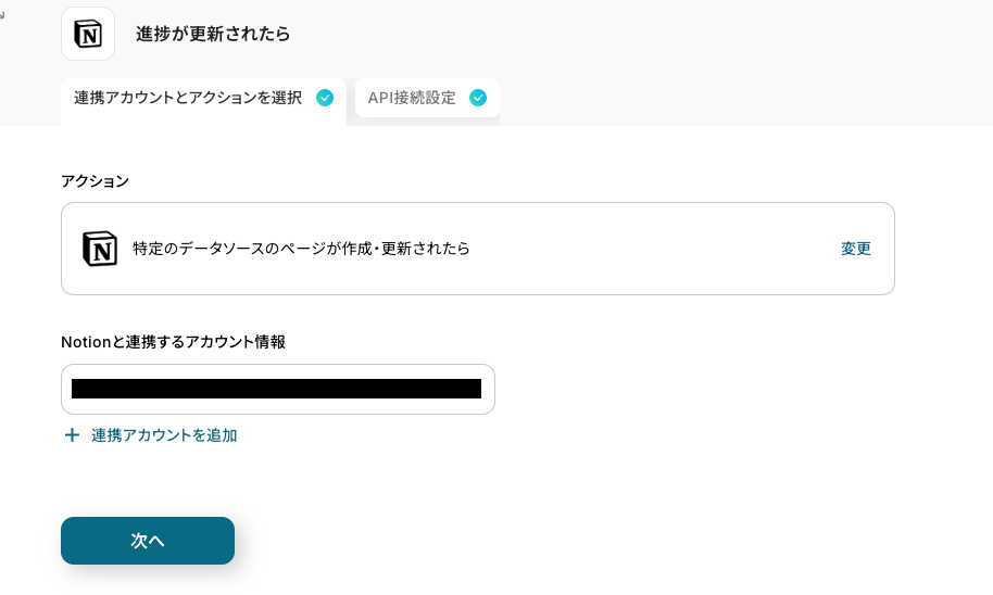 以下の画面が表示されたら、タイトルを任意で修正し、連携するアカウントを確認します。アクションは変更せず、次に進みましょう!