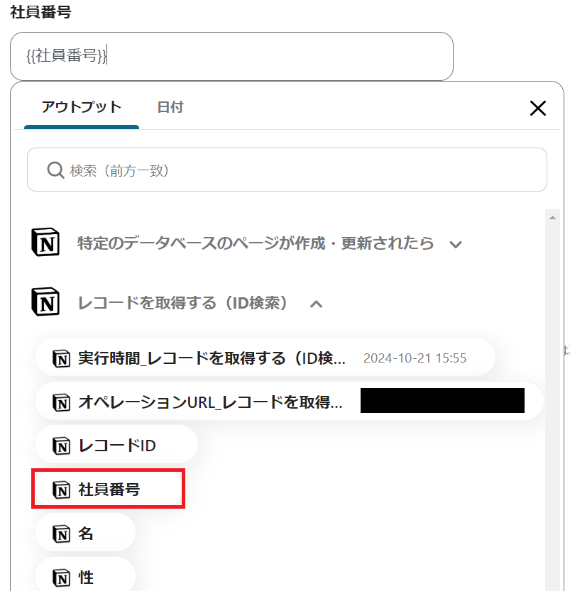 Notionの「レコードを取得する(ID検索)」のアウトプットを使用して設定しましょう。