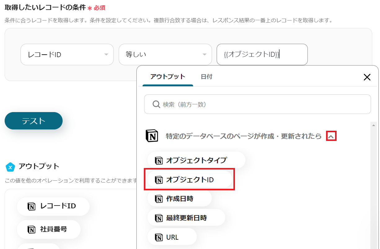 クリックすると、アウトプットが表示されるので、「オブジェクトID」を選択します。