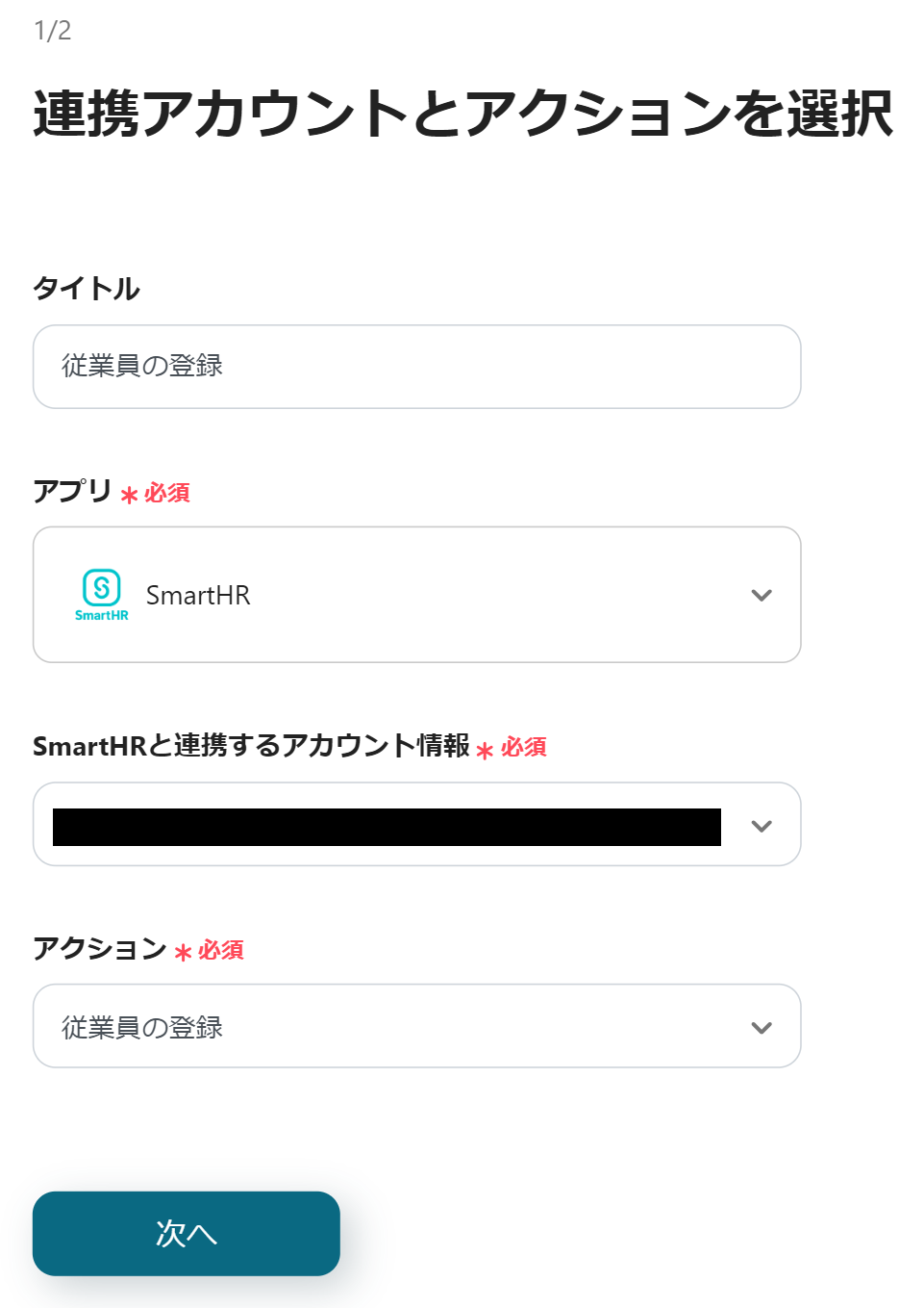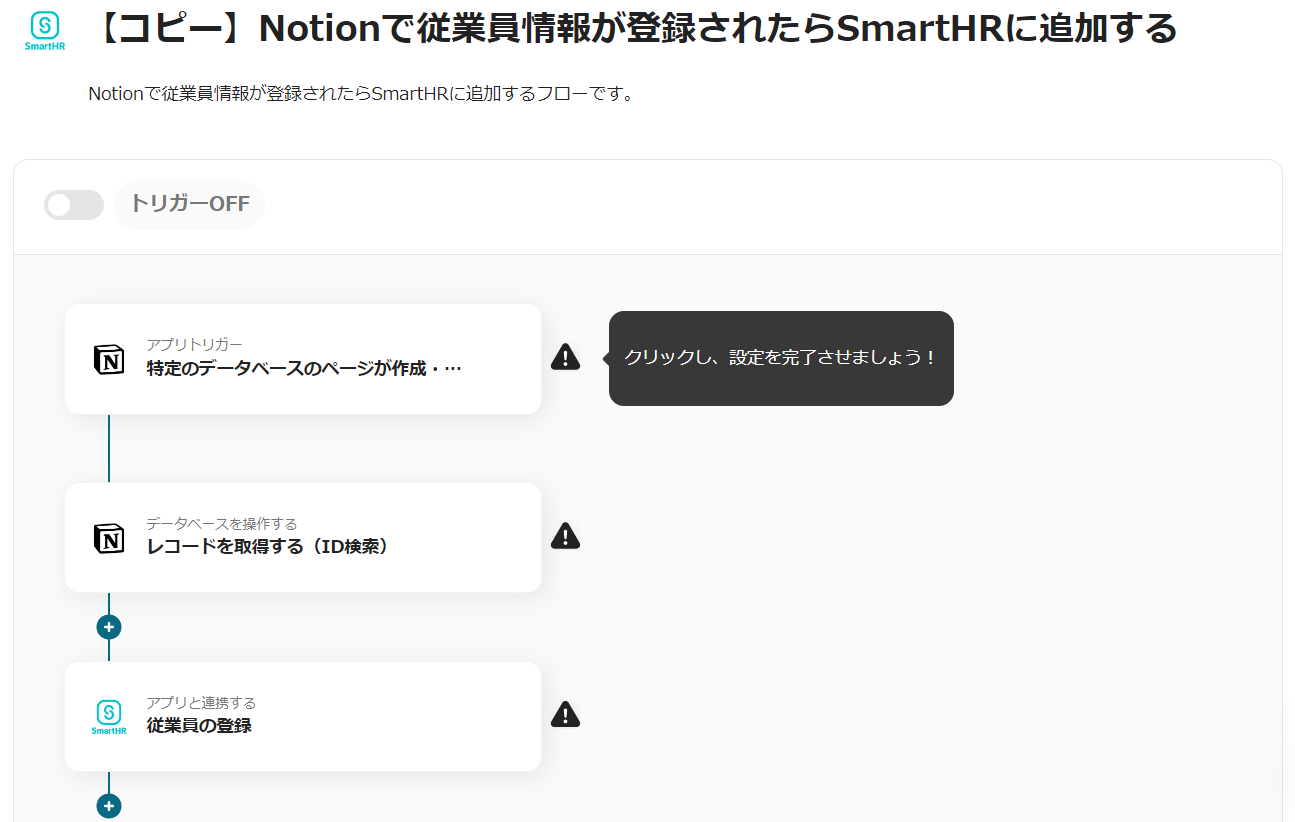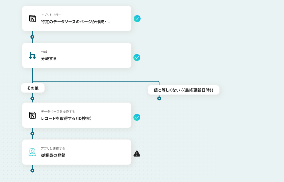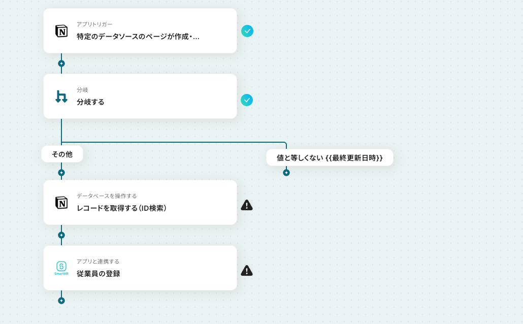1.SmartHRで従業員情報が更新されたら、自動的にNotionの従業員管理台帳を更新するフローです。