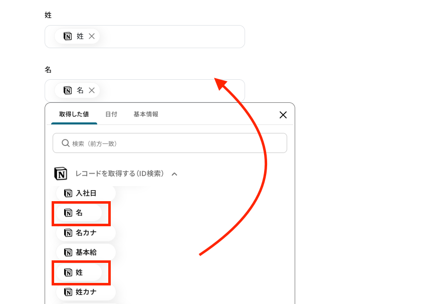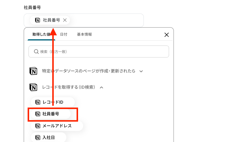 Notionの「レコードを取得する(ID検索)」の『取得した値』を使用して設定しましょう。