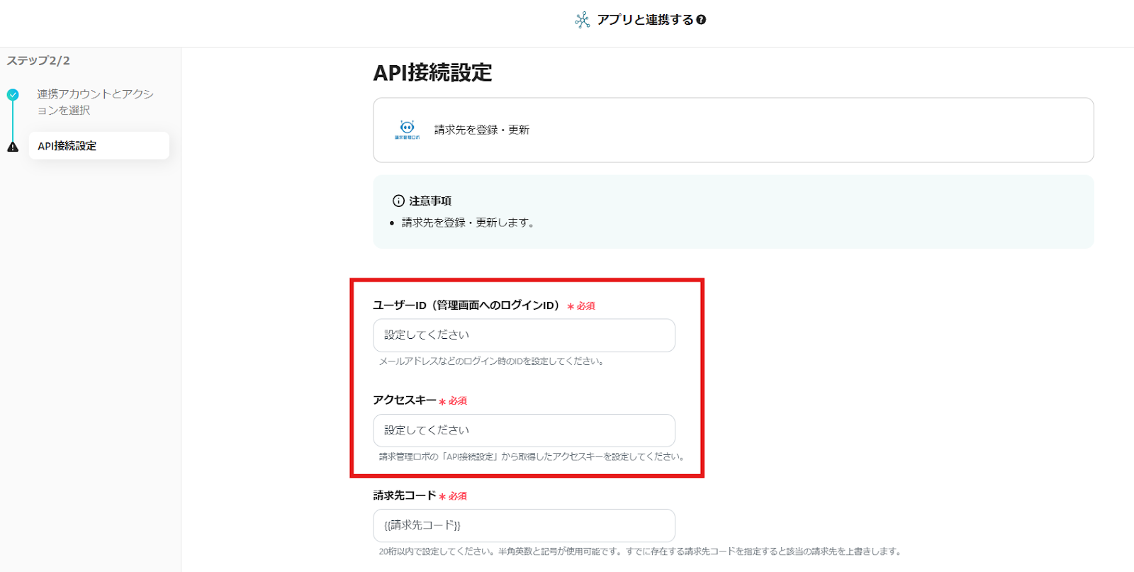 請求先コードは設定が完了しているため、赤枠の2つの入力を行います。