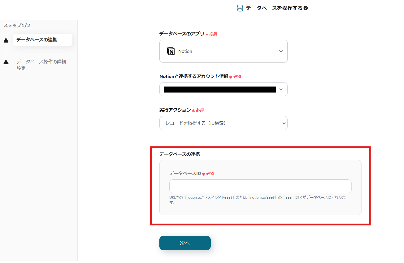 再びデータベースIDを入力します。ボックスをクリックしてください。