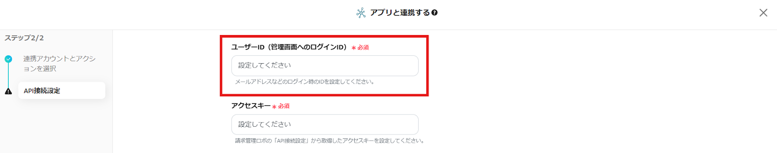 次にアクセスキーに関しては、マイアプリ連携の際に使用したアクセストークンを入力してください。