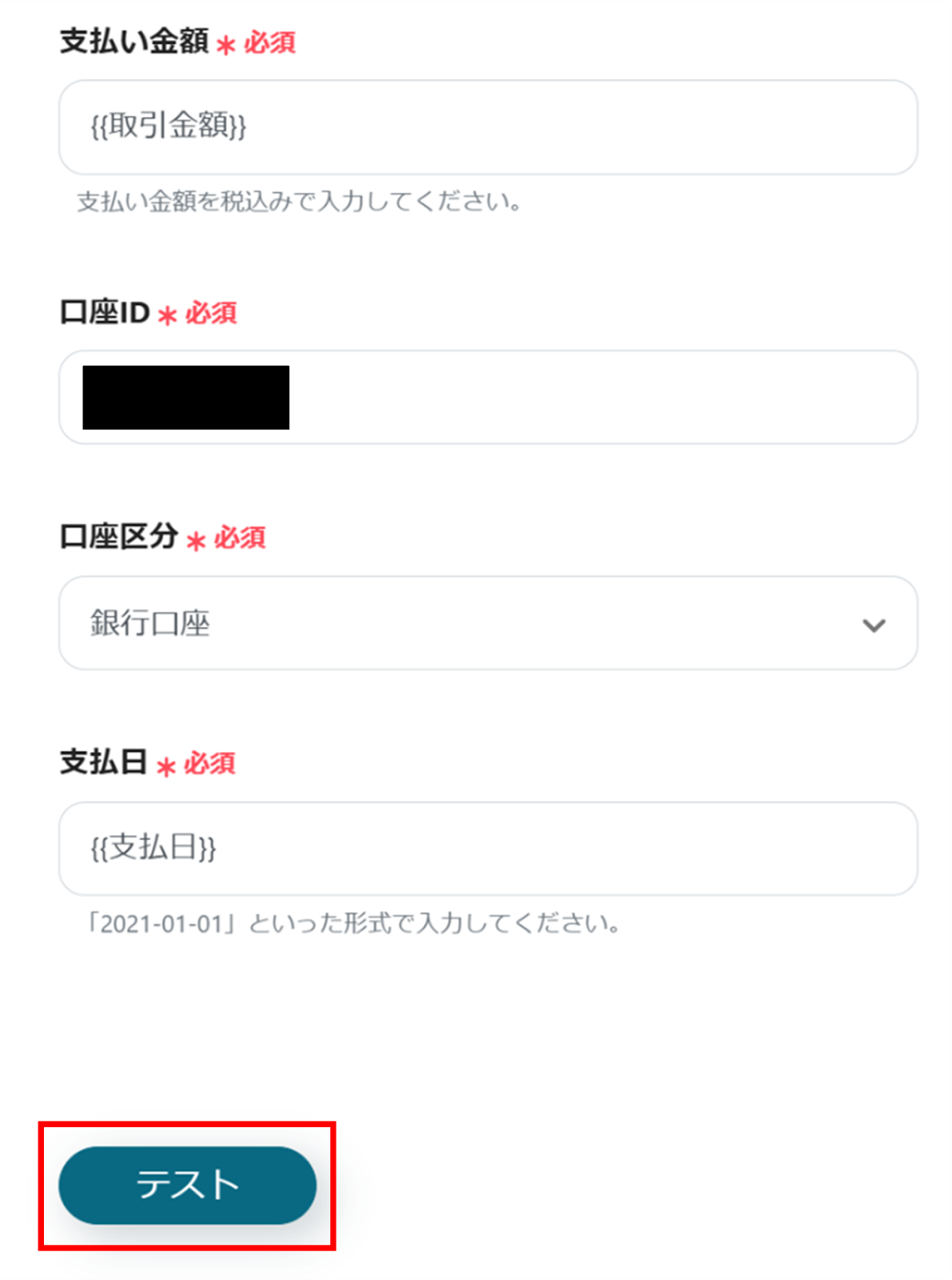 入力が完了したら「テスト」をクリックし、エラーが発生しなければ「保存する」をクリックします。