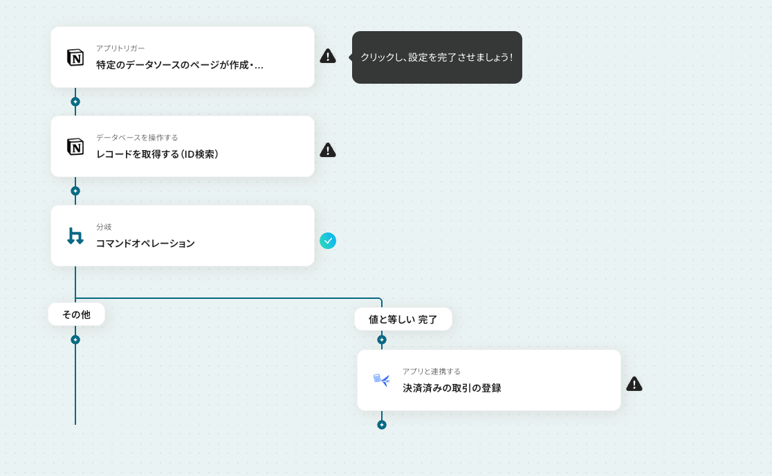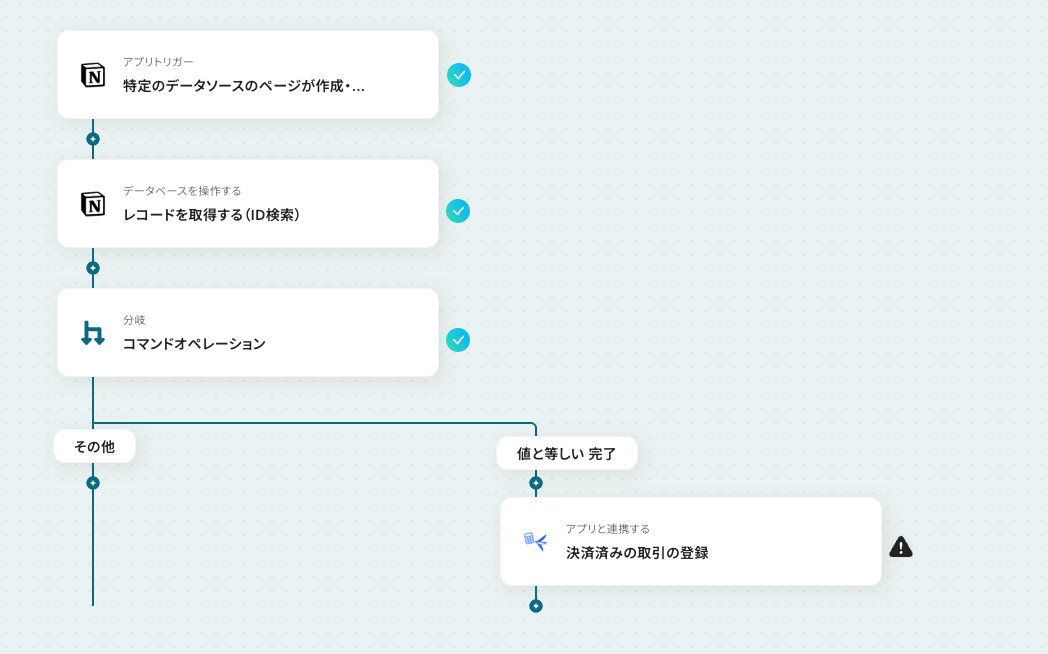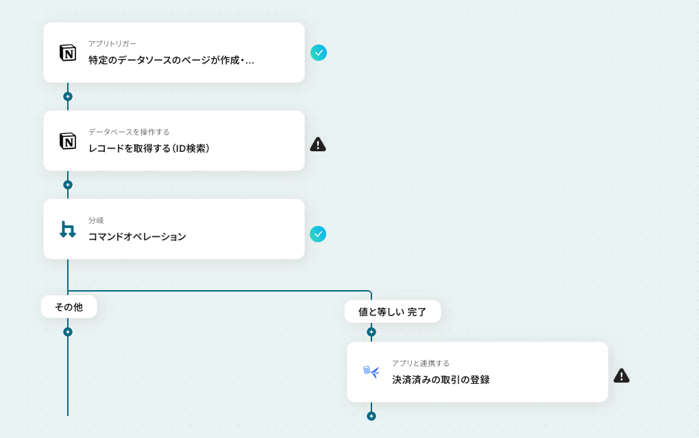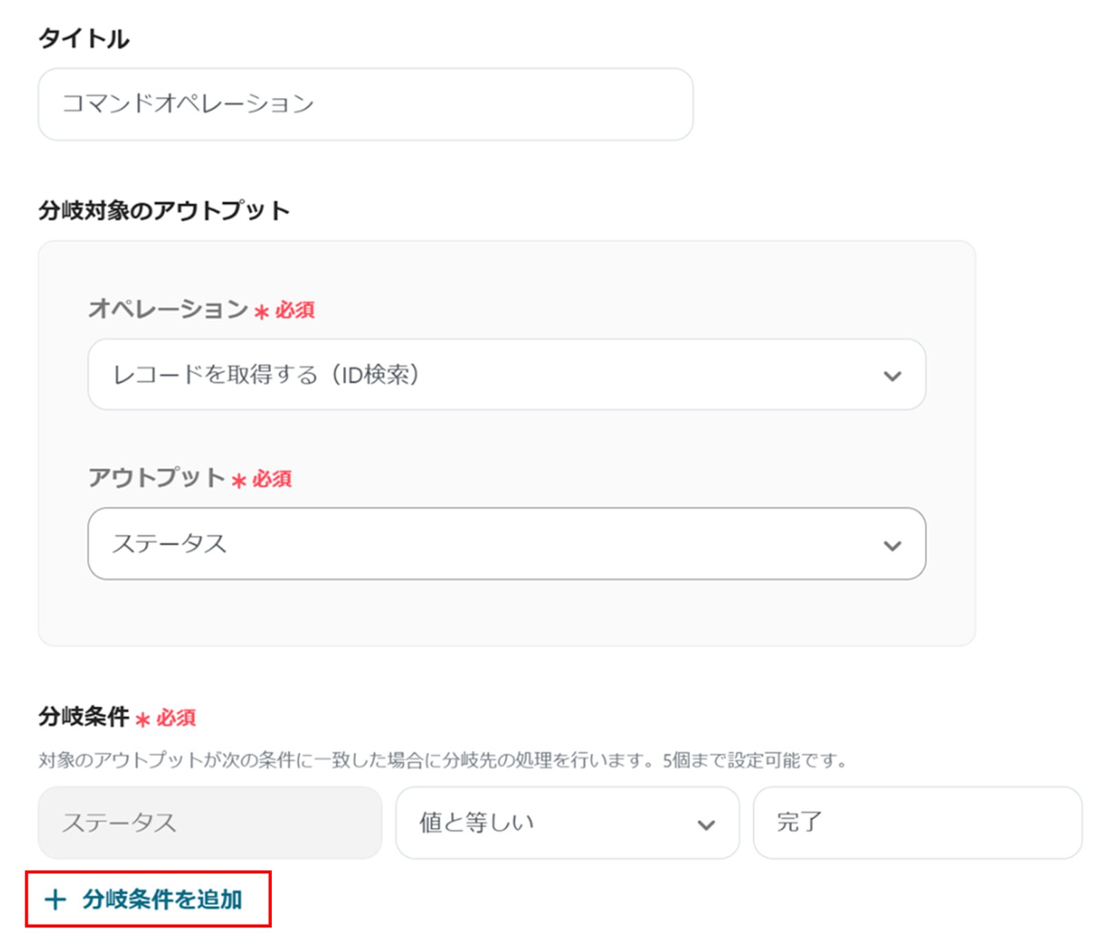 - オペレーションで分岐機能を設定し、特定のステータスになった場合のみ後続の処理が実行されるようにします。