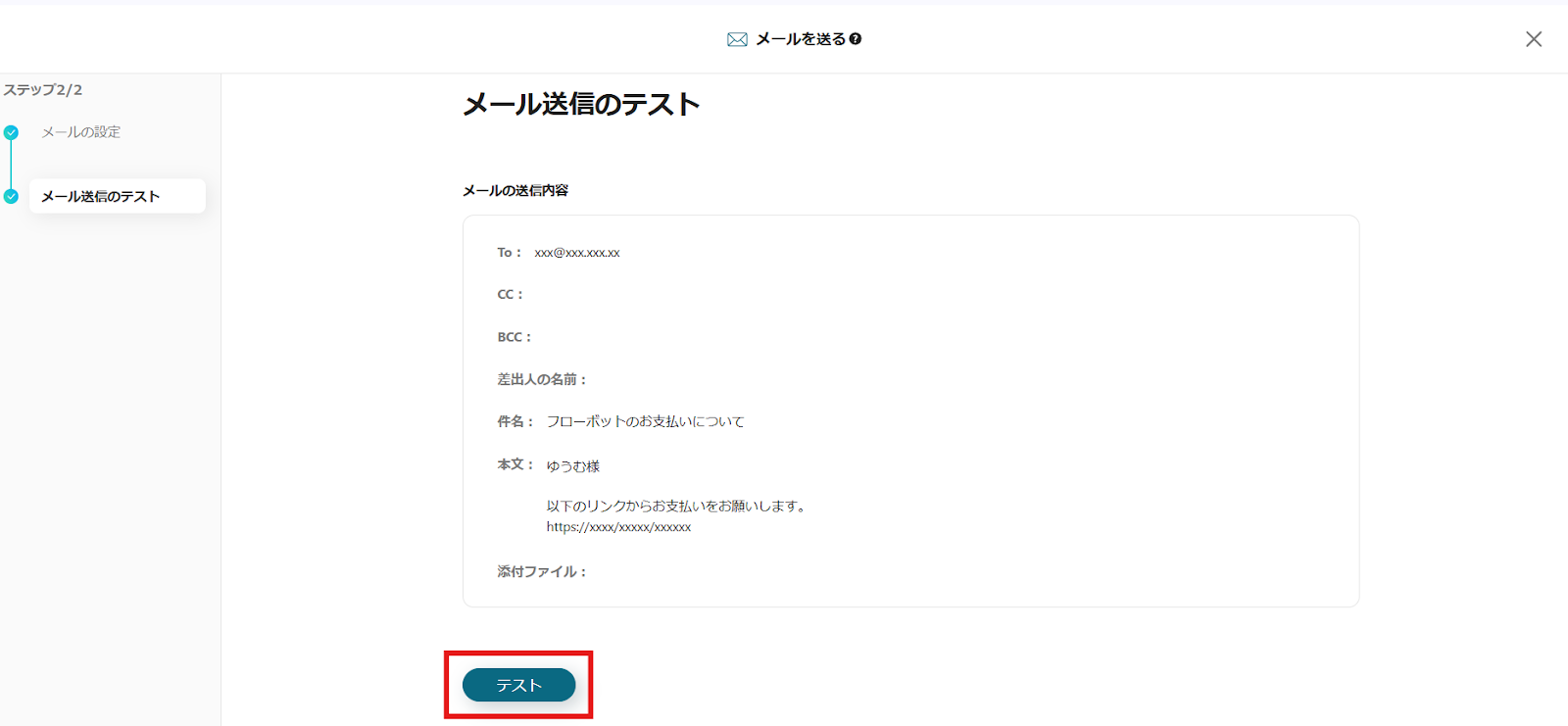 入力が完了したら「テスト」をクリックして、設定した内容で支払いリンクが作成されるか確認しましょう。
