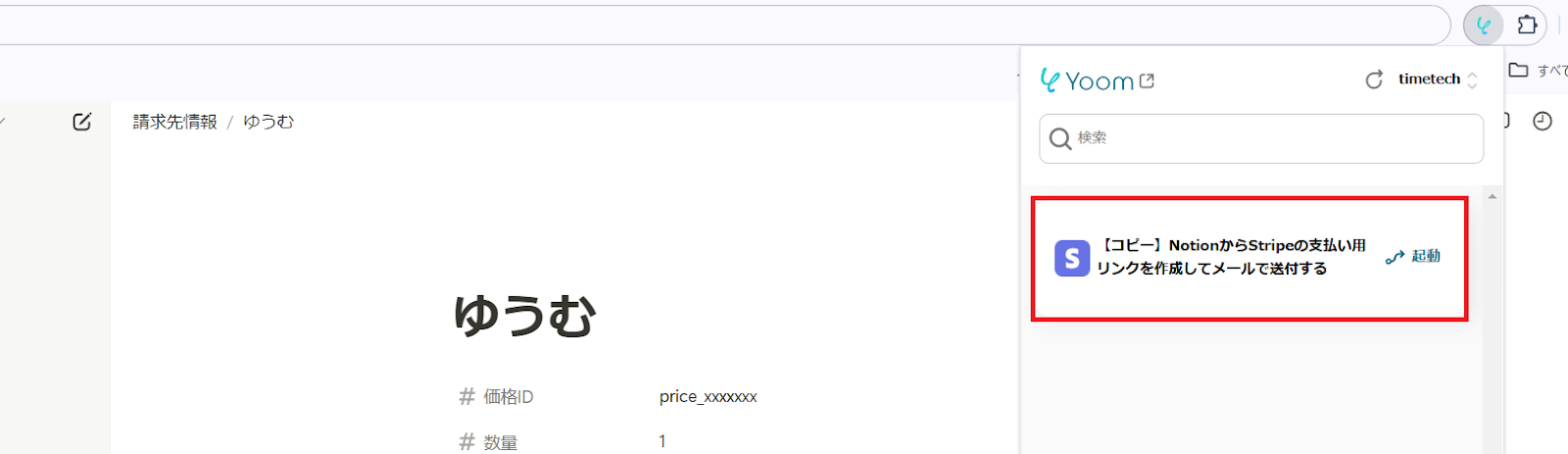 Chrome拡張機能とNotionのAPIを利用することで、Notionのページからフローボットを起動し、Notionに格納しているデータを受け取ることができます。その後、Stripeの提供するAPIを用いて請求URLを作成し、no-reply@yoom.funよりメール送付が可能です。