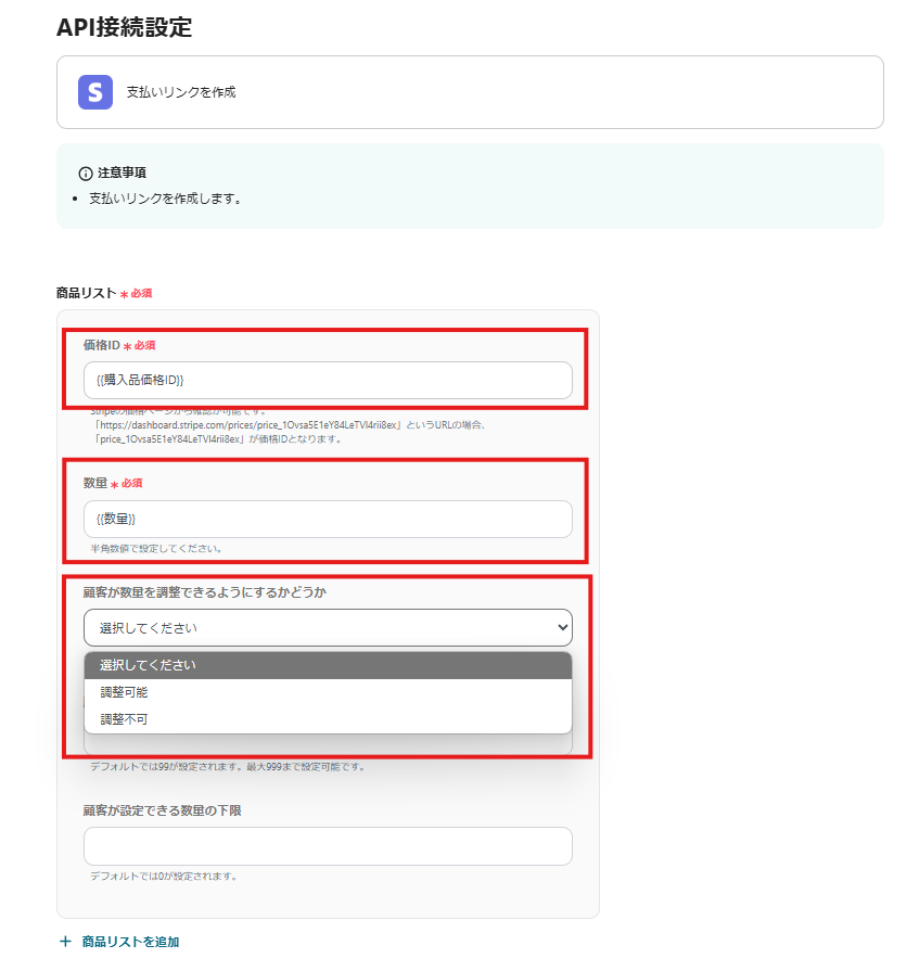 「価格ID」・「数量」を入力していきます。クリックするとアウトプットのところに候補がでてきますので、そちらを選択します。