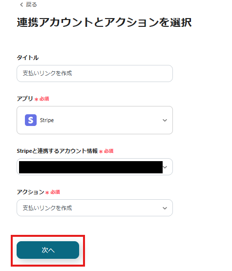 「Stripeと連携するアカウント情報」に間違いないか確認し、次へ進みます。