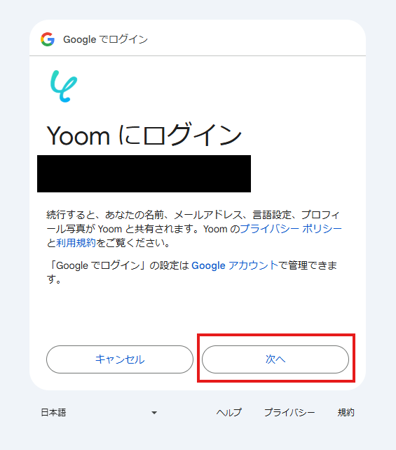 下記画面が出ましたら、「Sign in with Google」を選択し、「アカウント」を選択し、次へをクリックします。