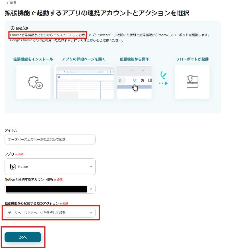 「拡張機能から起動する際のアクション」を「データベース上でページを選択して起動」を選び「次へ」をクリックします。
