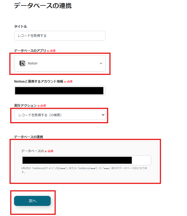 「Notionと連携するアカウント情報」に間違いないか確認し、実行アクションを選択し「データベースID」を入力して「次へ」をクリックします。