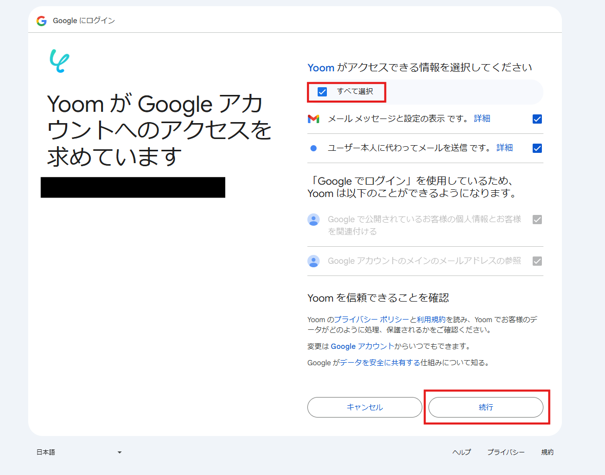 下記画面が出ましたら、「アクセスできる情報」を「すべて選択」にチェックをいれて「続行」してください。
