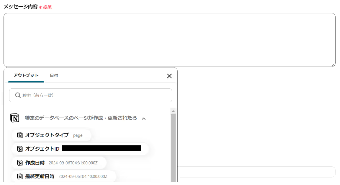 「オブジェクトタイプ」「オブジェクトID」「作成日時」「最終更新日時」「URL」といった情報を、変数として通知可能です。