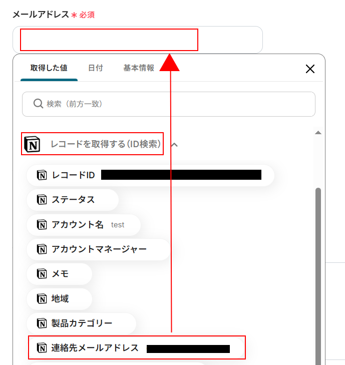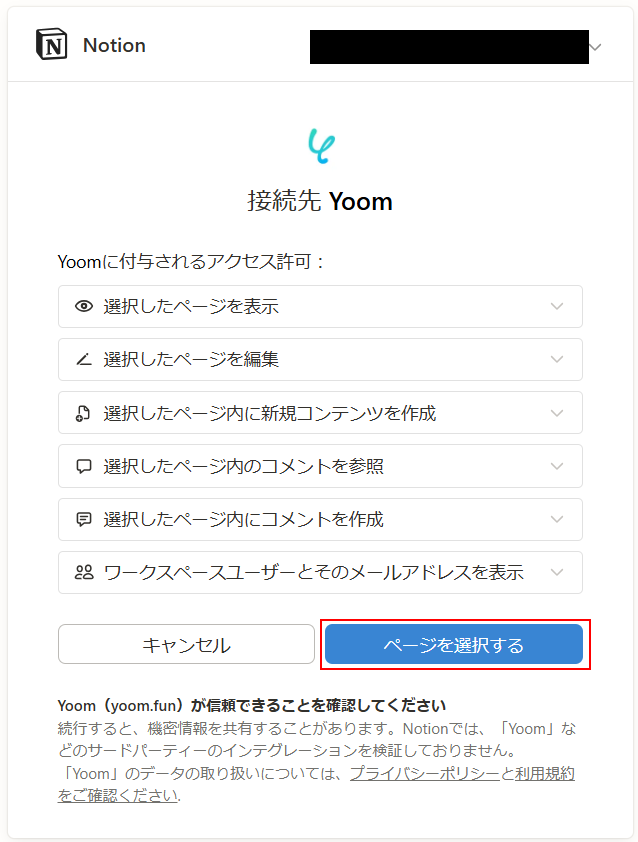 Notionと連携するアカウント情報には、ステップ1で連携したアカウントが設定されています。