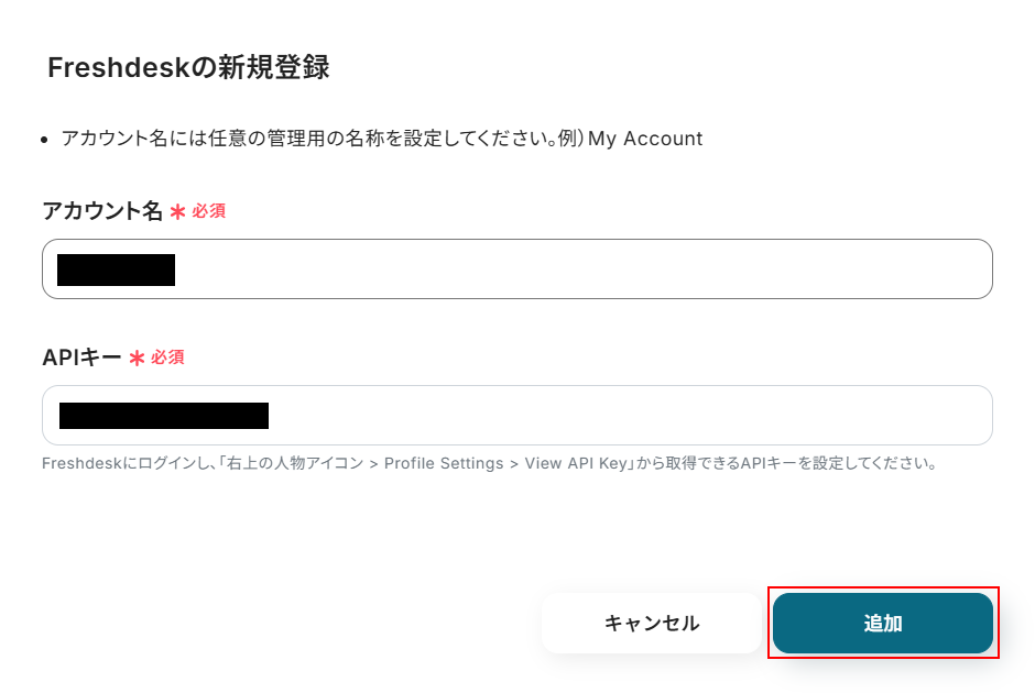 次に下の画面が表示されたら、アカウント名とAPIキーを入力し「追加」をクリックしましょう。