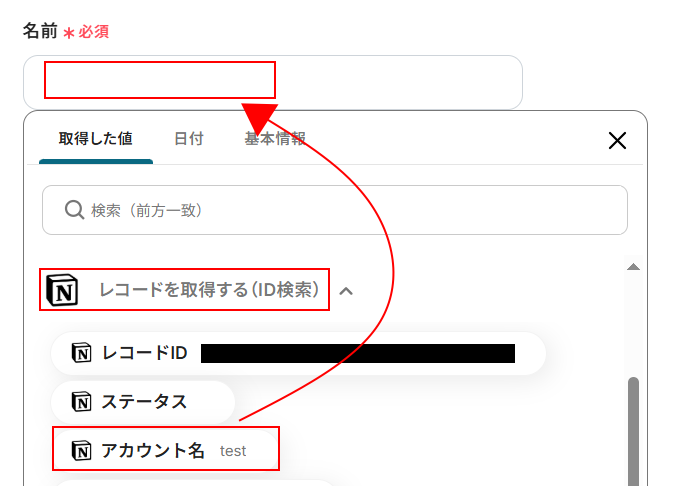 - 続いて、Notionの「レコードを取得する(ID検索)」アクションで、トリガーとなったページの詳細情報を取得します