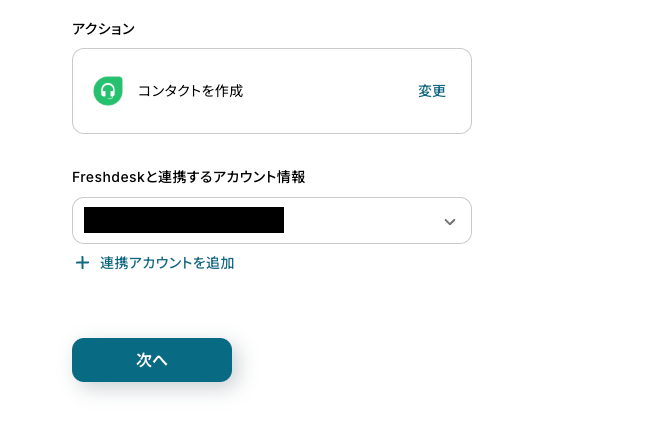 - 最後に、オペレーションでFreshdeskの「コンタクトを作成」アクションを設定し、Notionから取得した情報をもとにコンタクトを作成します