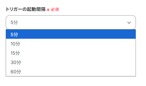 - トリガーの起動間隔は5分、10分、15分、30分、60分の間隔で選択できます。