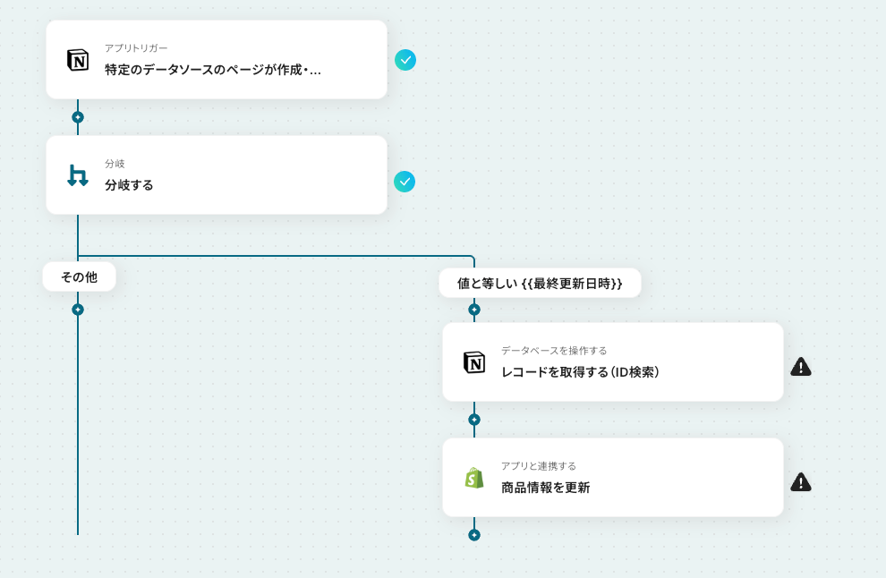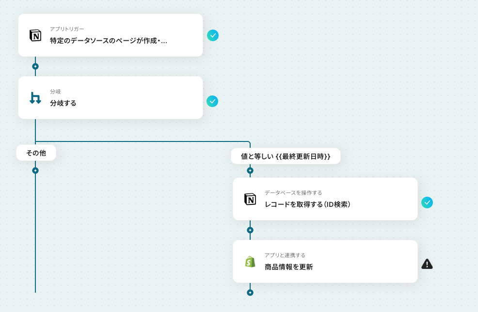このフローボットは、Shopifyの商品IDをNotionのデータベースから検索し、該当の行に更新があれば自動でShopifyの商品情報を反映します。