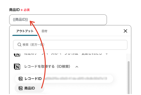 - 編集欄をクリックします。プルダウンを開き、「レコードIDを取得する」タブで商品IDを選び、引用コードを埋め込みます。