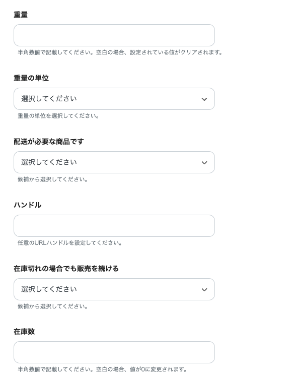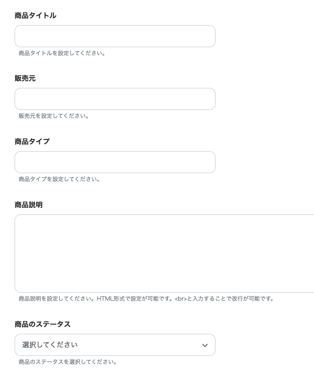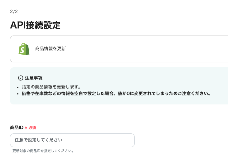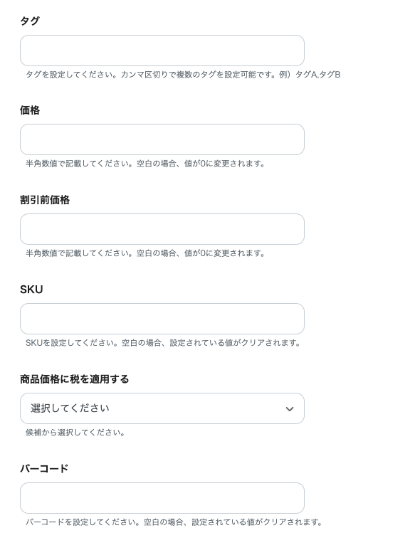 必須項目は商品IDのみです。商品IDが必須なのは、こちらをユニークキーに設定するためです。