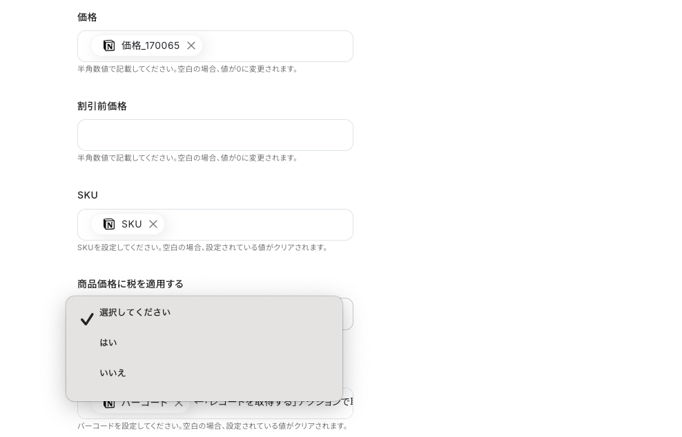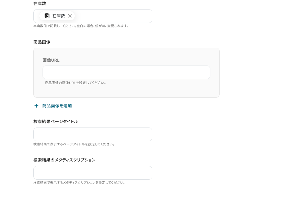 - Shopifyの商品情報を更新するオペレーションでは、各登録項目に固定値を入力したり、前段で取得した値を埋め込んだりするなどのカスタムができます