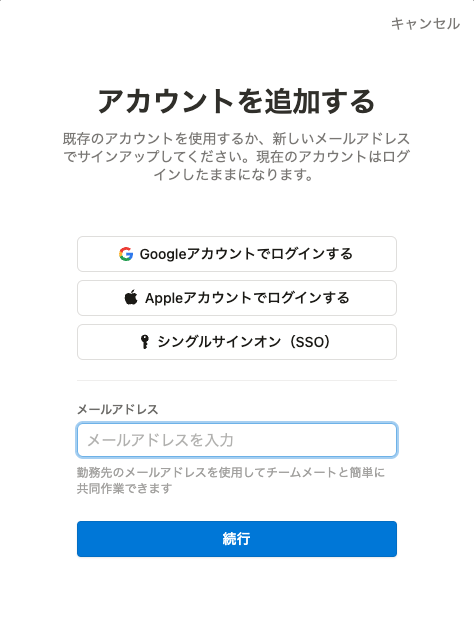 - 連携するNotionアカウントのログイン方法を選択し、各項目を入力後に続行をクリックします。