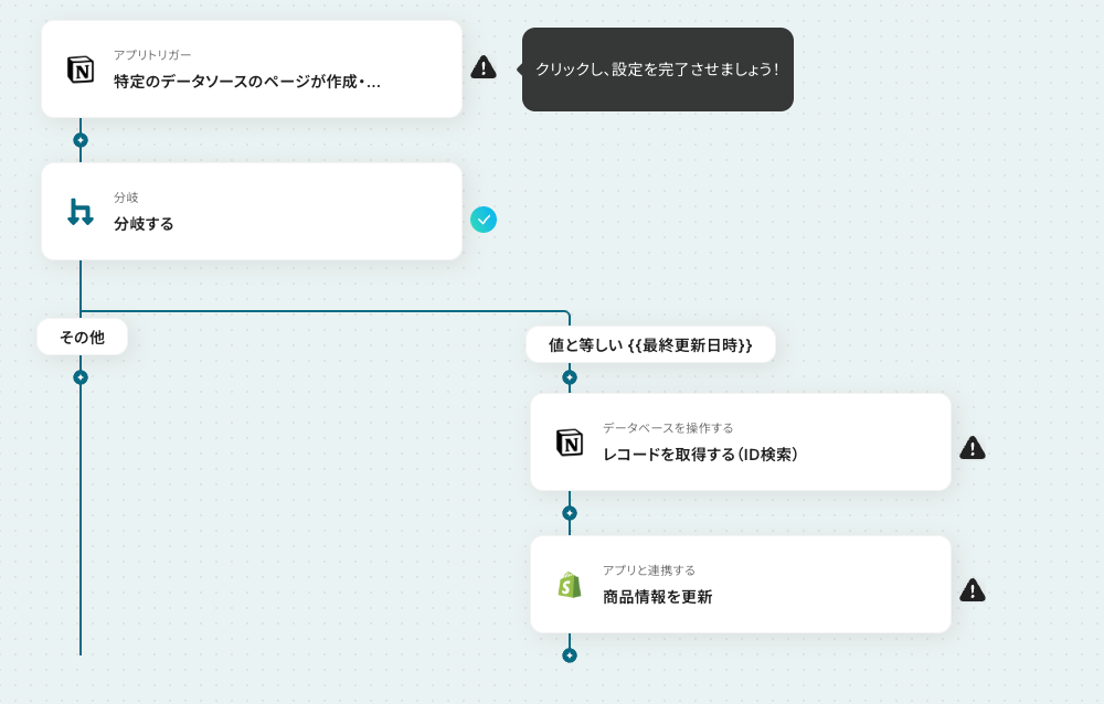 このフローボットは、設定された時間ごとに自動で起動し、Notionで更新された商品情報をShopifyに反映します。
