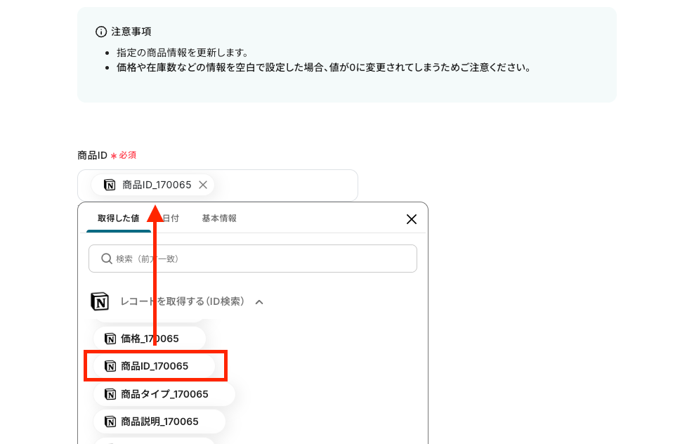 その他、更新する項目は同様に『取得した値』を引用し紐付けします。