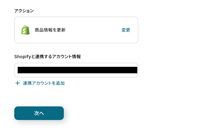 - 最後に、オペレーションでShopifyの「商品情報を更新」アクションを設定し、取得した情報をもとにShopifyの商品データを更新します