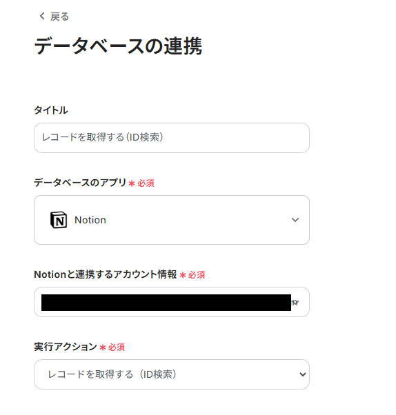 オペレーションに「レコードを取得する(ID検索)」、アウトプットに検知したい項目を設定します。