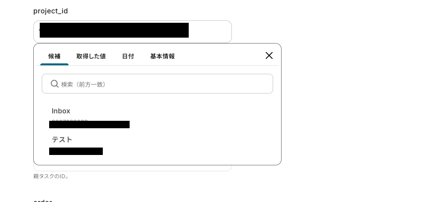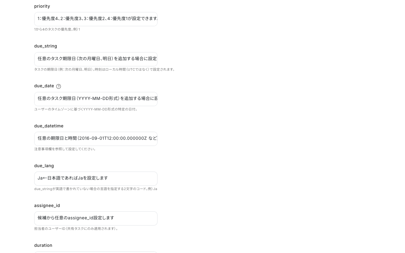 - Todoistでタスクを更新するアクションでは、更新するタスクの内容(content)や詳細(description)、プロジェクトIDなどを任意で設定してください。