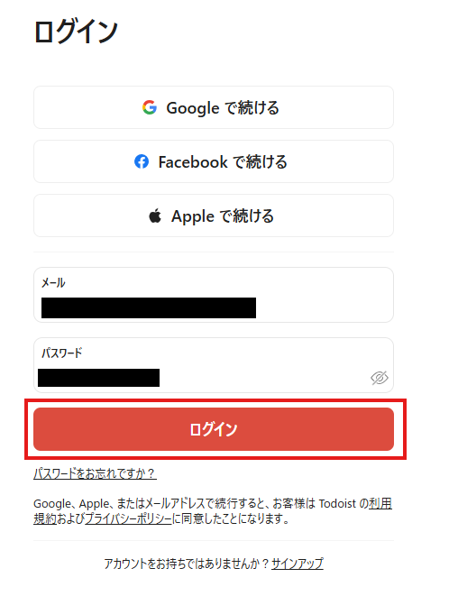 次の画面で、メールとパスワードを入力し、「ログイン」をクリックします。