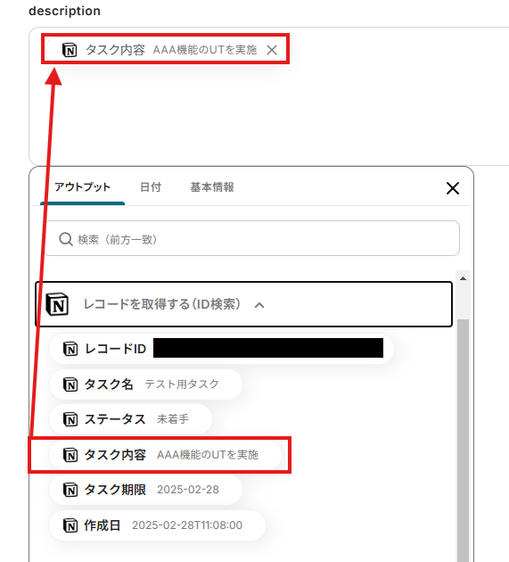 2.「更新後のレコードの値」は、入力欄をクリックして表示されるアウトプットからTodoistの情報を選択できます。(課題のURLを設定することもできます)