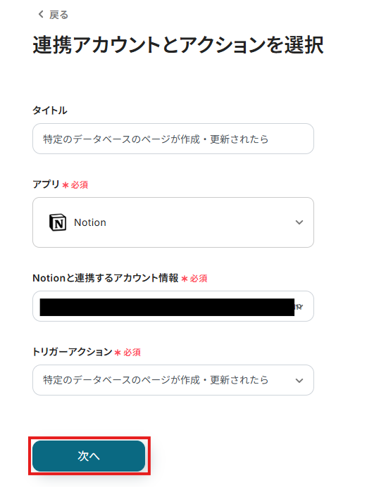 2.表示された画面で必須項目を入力します。トリガーアクションはそのままにして、「次へ」をクリックしましょう。