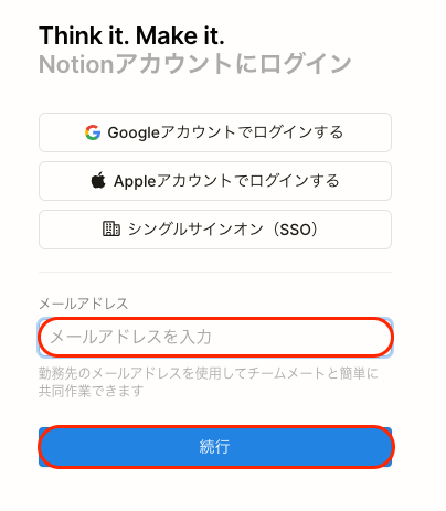 2.表示された画面で、メールアドレスを入力し、「続行」をクリックしてください。