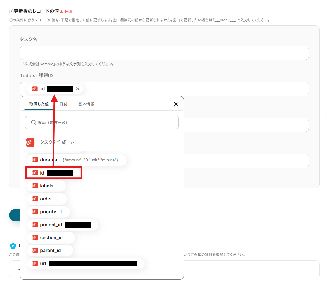- 最後に、オペレーションでTodoistの「タスクを更新」を設定し、取得した情報をもとに対応するタスクを更新します。
