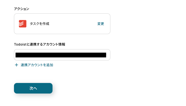 - 最後に、オペレーションでTodoistの「タスクを作成する」アクションを設定し、前のステップで取得した情報をもとにタスクを作成します。