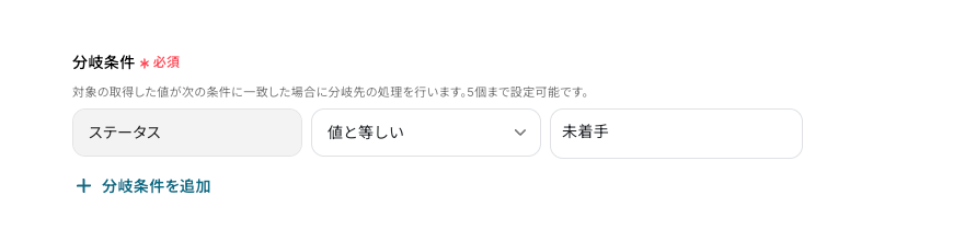 - 分岐機能では、後続の処理に進むための条件(例:ステータスプロパティが「完了」の場合など)を任意で設定してください。