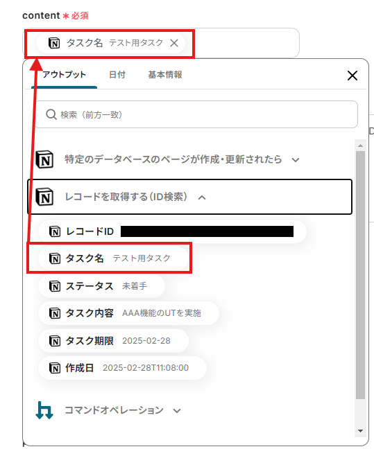「content」は、入力欄をクリックして表示されるアウトプットから選択してください。